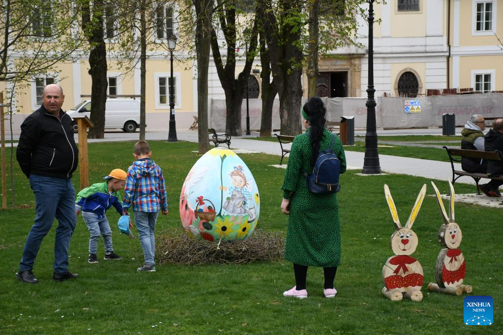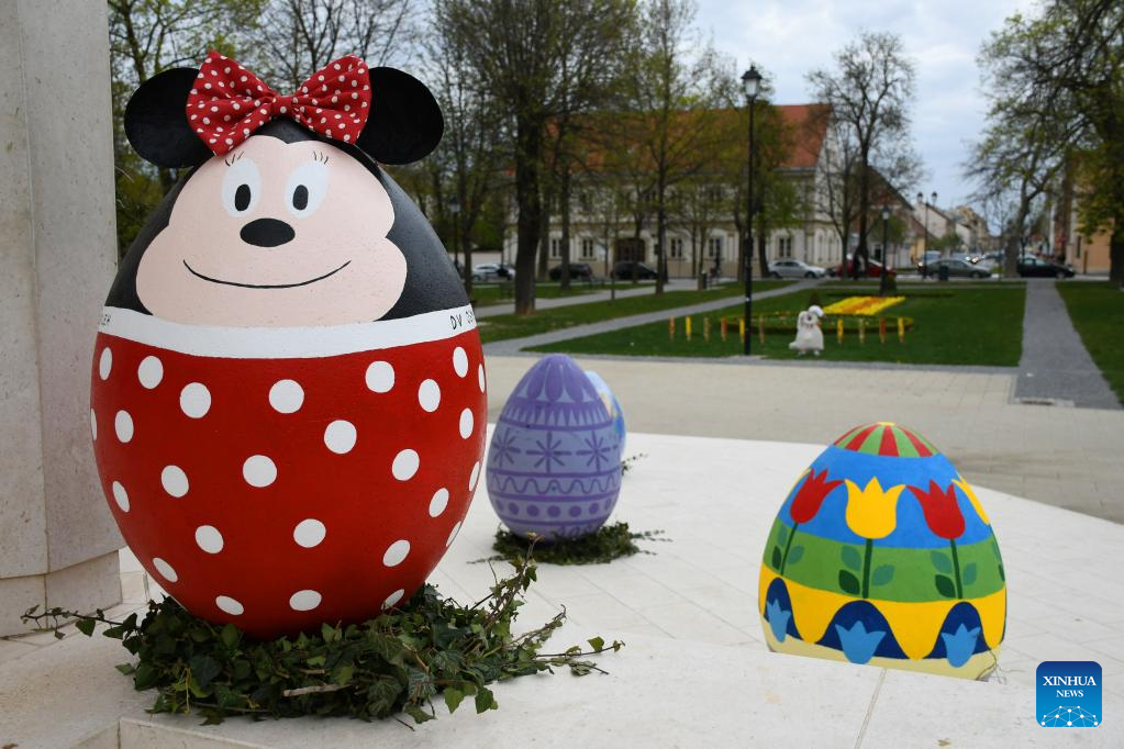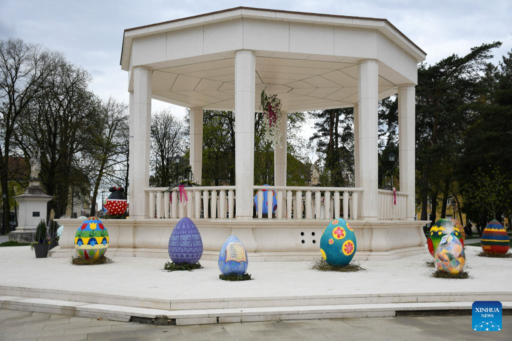 Big Easter eggs for the upcoming Easter holiday are seen in central Bjelovar, Croatia, on April 9, 2022. (Damir Spehar/PIXSELL via Xinhua)