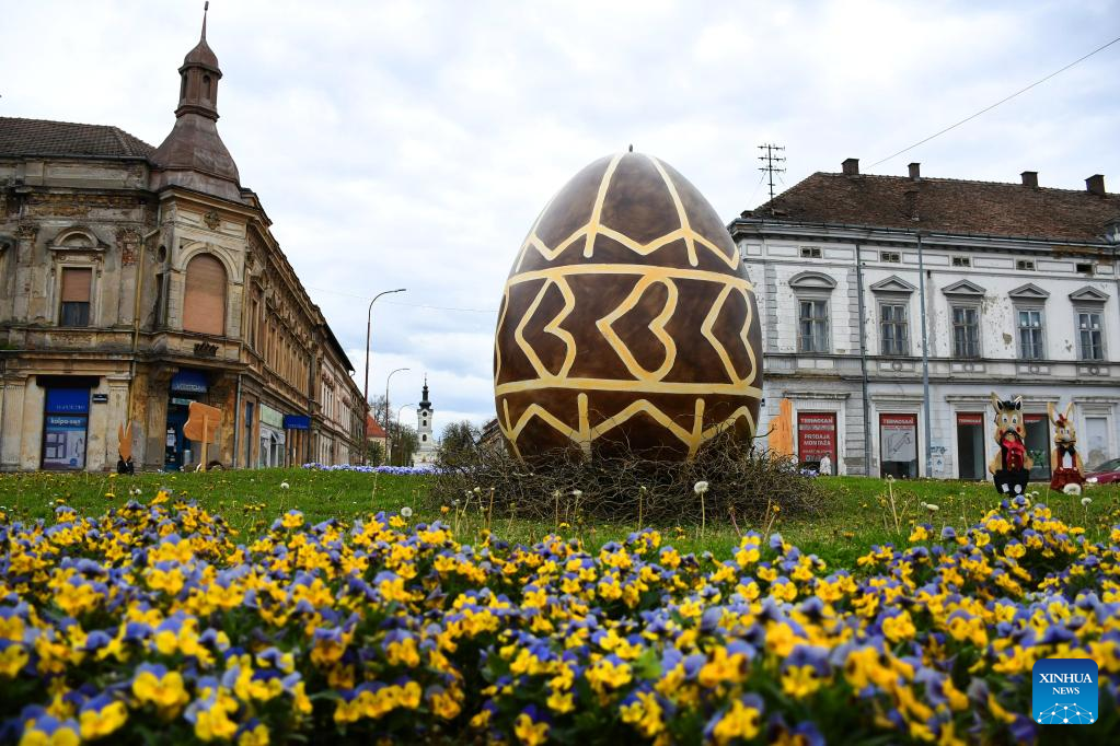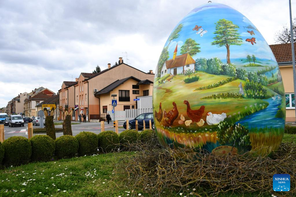 A huge Easter egg for the upcoming Easter holiday is seen in central Bjelovar, Croatia, on April 9, 2022. (Damir Spehar/PIXSELL via Xinhua)