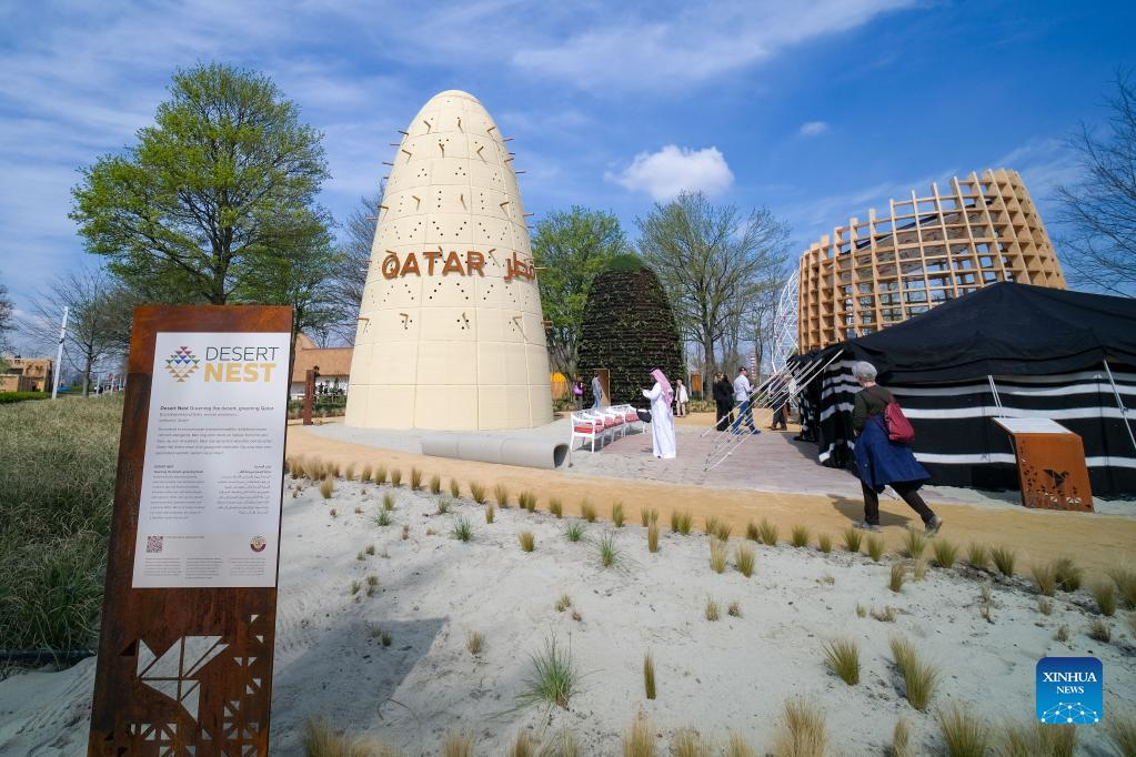 People visit Qatar's pavilion at Floriade Expo 2022 in Almere, the Netherlands, on April 14, 2022. With the theme "Growing Green Cities," Floriade Expo 2022, a world horticultural exhibition, opened here on Thursday. (Xinhua/Zhang Cheng)