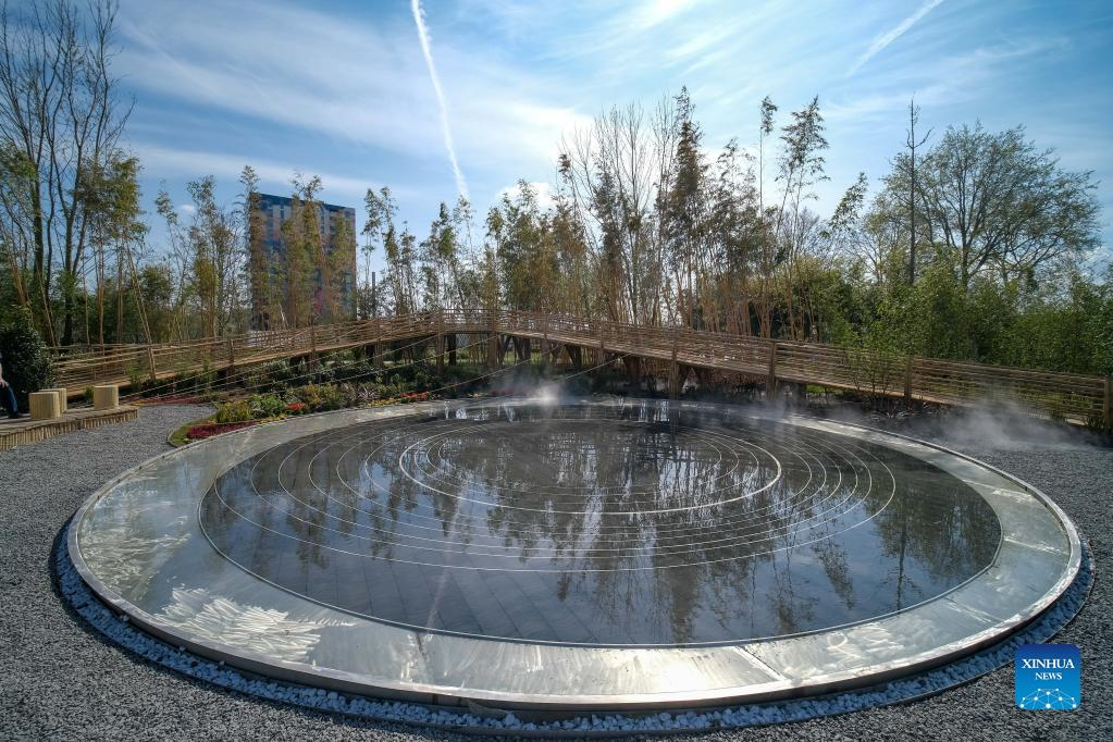 Photo taken on April 14, 2022 shows a view of China's pavilion at Floriade Expo 2022 in Almere, the Netherlands. With the theme "Growing Green Cities," Floriade Expo 2022, a world horticultural exhibition, opened here on Thursday. (Xinhua/Zhang Cheng)