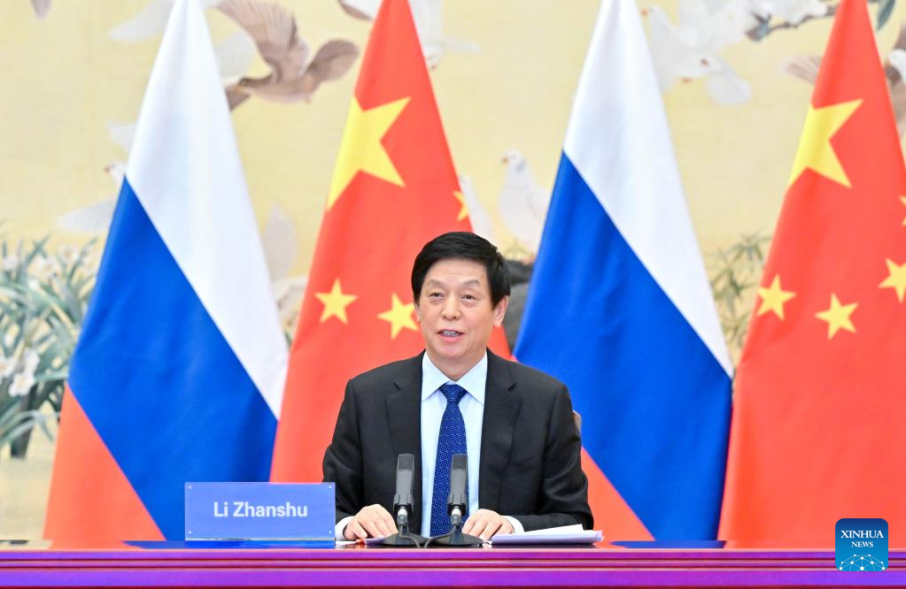 BEIJING, April 15 (Xinhua) -- Li Zhanshu, chairman of the National People's Congress (NPC) Standing Committee, held talks with Russian Federation Council Speaker Valentina Matviyenko via video link on Friday.