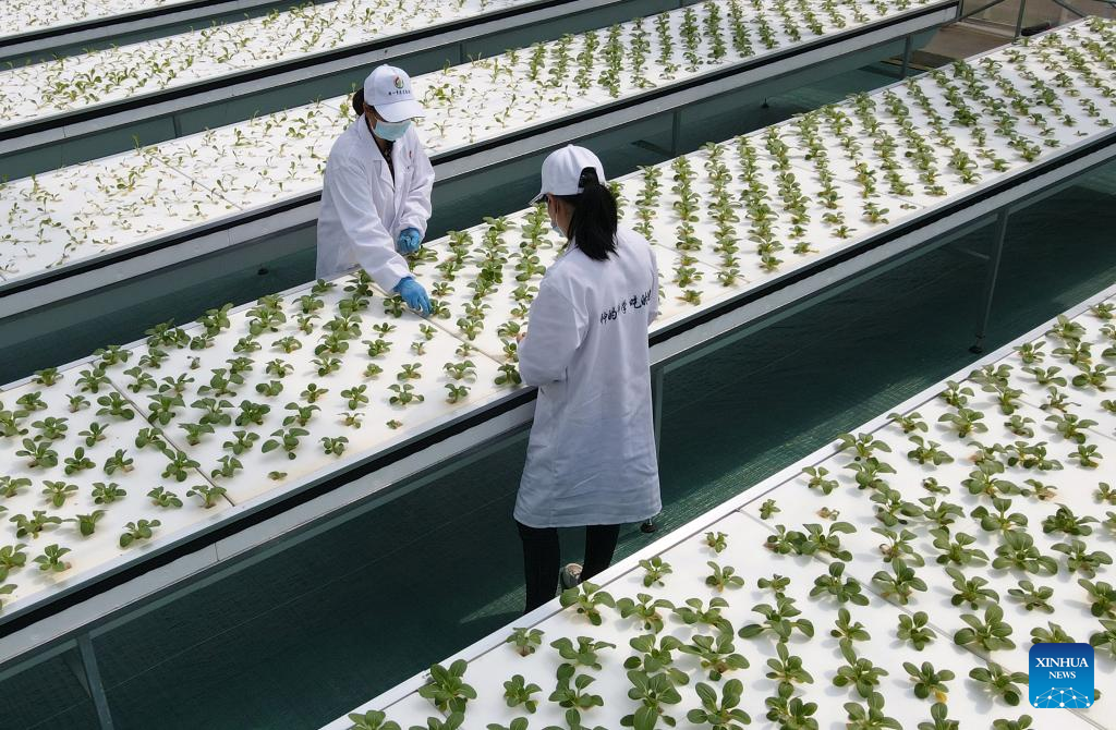 Aerial photo taken on April 20, 2022 shows staff members working at a smart greenhouse of Anhui modern aeroponics agricultural science and technology demonstration park in Feidong County, Hefei, east China's Anhui Province.