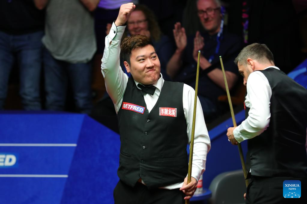 Yan Bingtao (L) of China celebrates after winning the 2nd round match against Mark Selby of England at the Betfred World Snooker Championships 2022 in Sheffield, Britain, April 23, 2022. (Photo by Zhai Zheng/Xinhua)