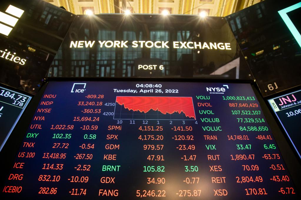 An electronic screen displays stock market information at the New York Stock Exchange (NYSE) in New York, the United States, April 26, 2022. U.S. stocks plunged on Tuesday with the tech-heavy Nasdaq closing down nearly 4 percent, as heavy selling intensified on Wall Street. The Dow Jones Industrial Average tumbled 809.28 points, or 2.38 percent, to 33,240.18. The S&P 500 fell 120.92 points, or 2.81 percent, to 4,175.20. The Nasdaq Composite Index shed 514.11 points, or 3.95 percent, to 12,490.74. (Photo by Michael Nagle/Xinhua)