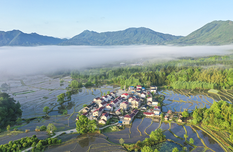Photo shows the sun shining over the terraces, and mist covering the village. ((Photo/Jiang Jianxing)