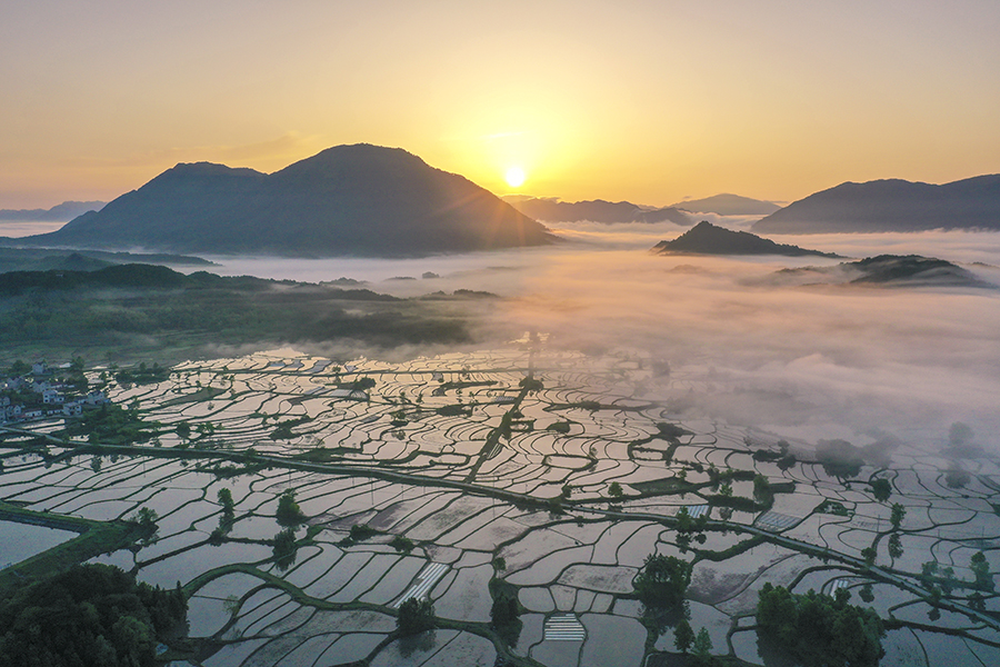 Photo shows vast terraced fields in the morning glow. (Photo/Jiang Jianxing)