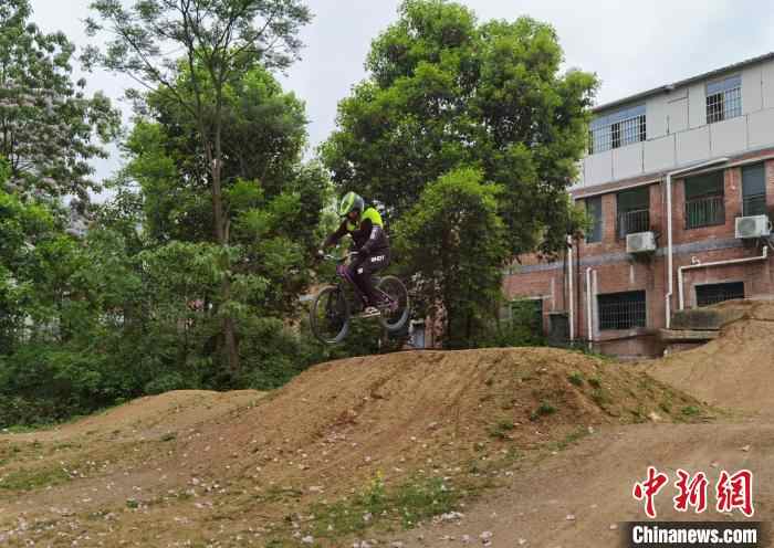 Photo shows Frederic Moal riding a BMX bike. (Chinanews.com/Zhou Yanling)