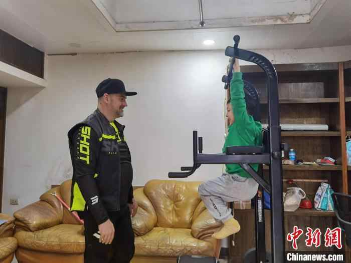 Photo shows Frederic Moal instructing his son on how to workout at home. (Chinanews.com/Zhou Yanling)