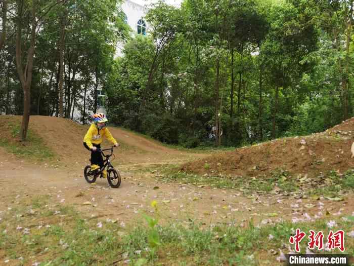 Photo shows Frederic Moal’s son riding a BMX bike. (Chinanews.com/Zhou Yanling)
