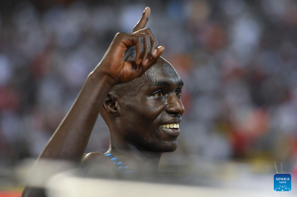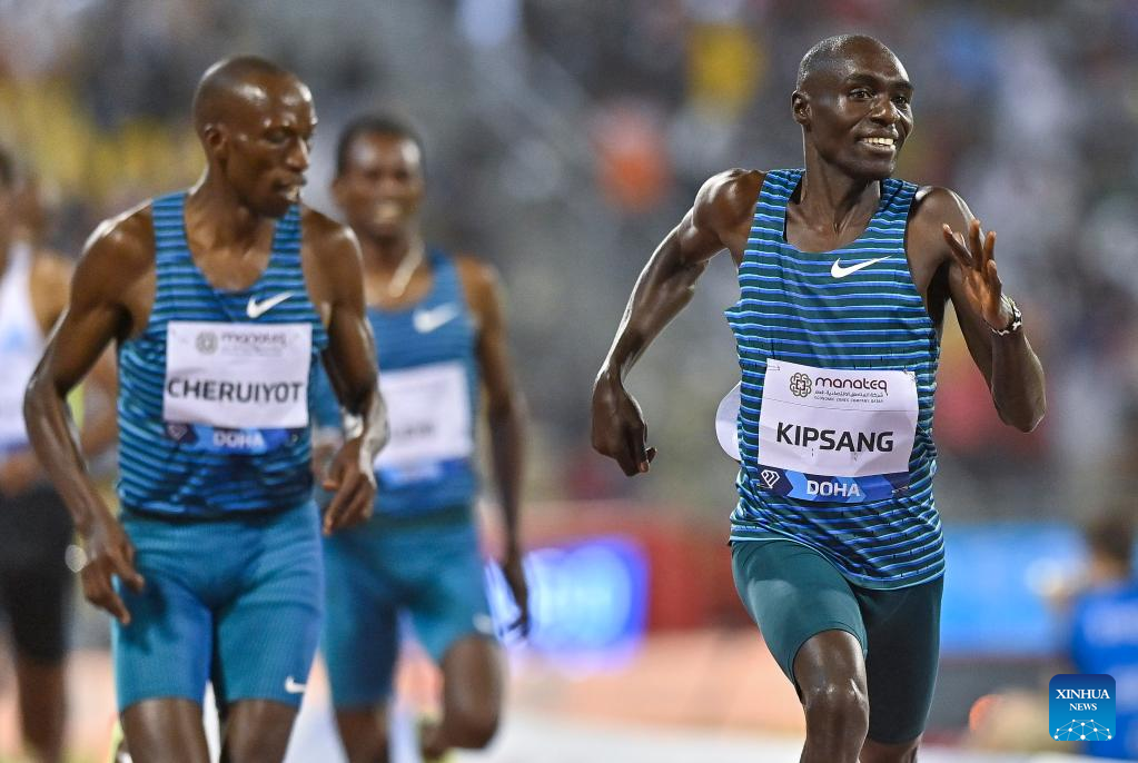 Abel Kipsang of Kenya celebrates after winning the men's 1,500m race of the Diamond League athletics meeting of 2022 diamond league Doha in Doha, capital of Qatar, May 13, 2022. (Photo by Nikku/Xinhua)