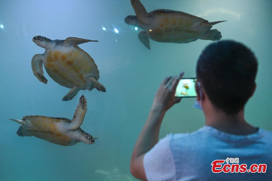 A visitor takes photos of sea turtles at Huidong Harbor Sea Turtle National Nature Reserve in Huizhou City, south China's Guangdong Province, May 18, 2022. (Photo: China News Service/Chen Wenmin)