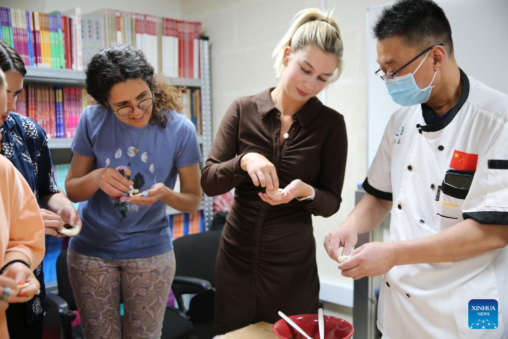 Students learn to make red bean buns during an event on Chinese medicine and culture in Msida, Malta, on May 20, 2022. (Xinhua/Chen Wenxian)