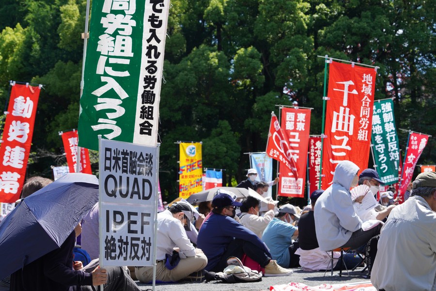 Protesters gather at Shiba Park in Tokyo, Japan, May 22, 2022. About 750 protesters took to the streets here against the planned U.S.-Japan summit and the summit of the Quadrilateral Security Dialogue (the Quad). (Xinhua/Zhang Xiaoyu)