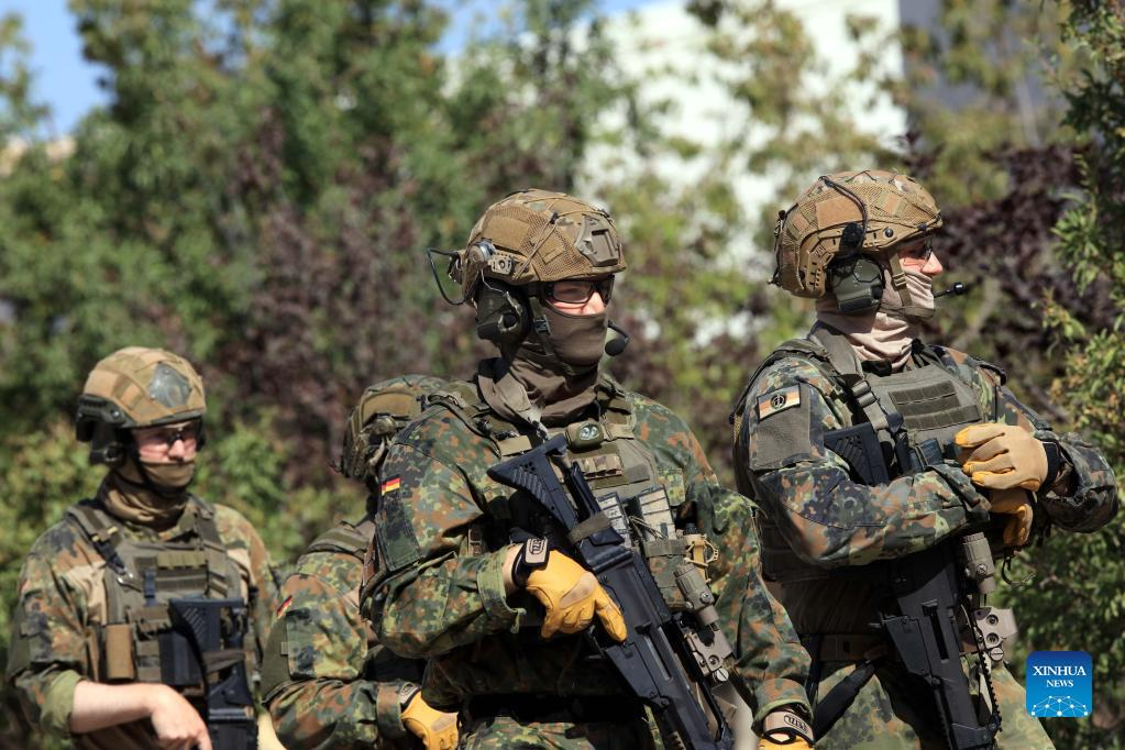 Team members from the German Armed Force take part in the 12th Annual Warrior Competition at the King Abdullah II Special Operations Training Center in Amman, Jordan, on June 7, 2022. The international 12th Annual Warrior Competition began on Sunday at King Abdullah II Special Operations Training Center in Jordan's capital Amman. A total of 40 teams representing 25 countries participate in this year's competition, which will last five days until Thursday, state-run Petra news agency reported. (Photo by Mohammad Abu Ghosh/Xinhua)
