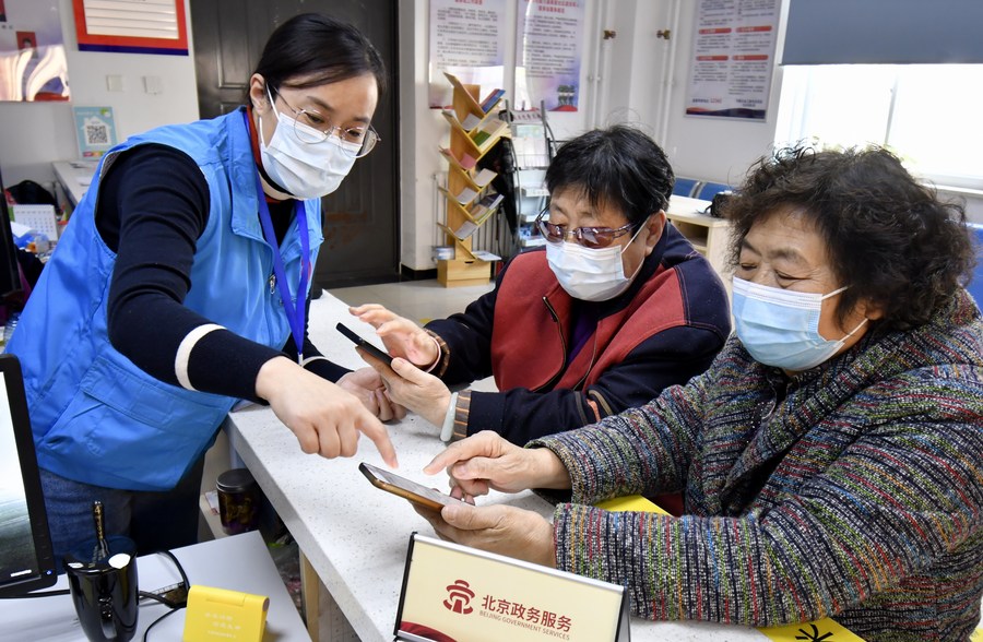 A volunteer helps seniors use an online payment APP at a community in Fengtai District, Beijing, capital of China, Nov. 12, 2021. (Xinhua/Li Xin)