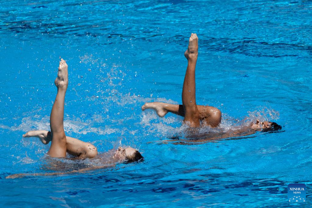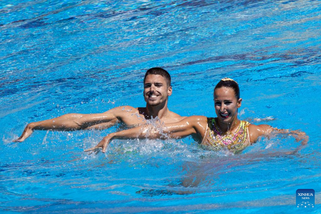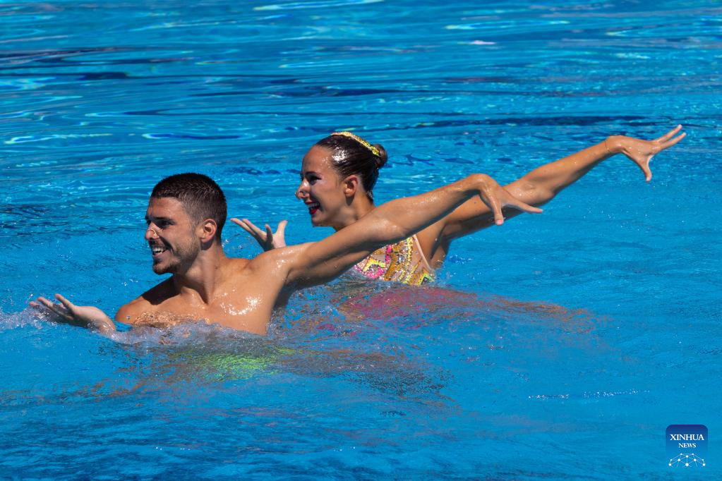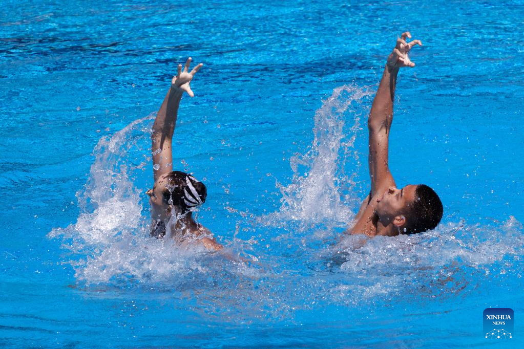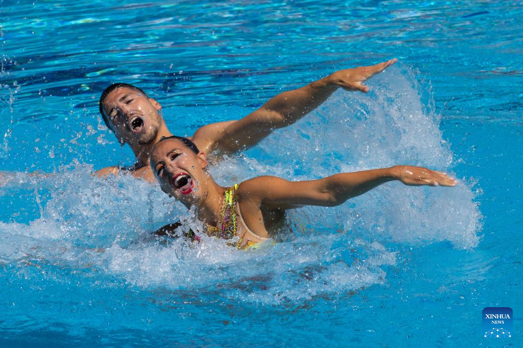 Italy's Giorgio Minisini(R)/Lucrezia Ruggiero compete during the Artistic Swimming Mixed Duet Technical Final at the 19th FINA World Championships in Budapest, Hungary, June 20, 2022. (Photo by Attila Volgyi/Xinhua)