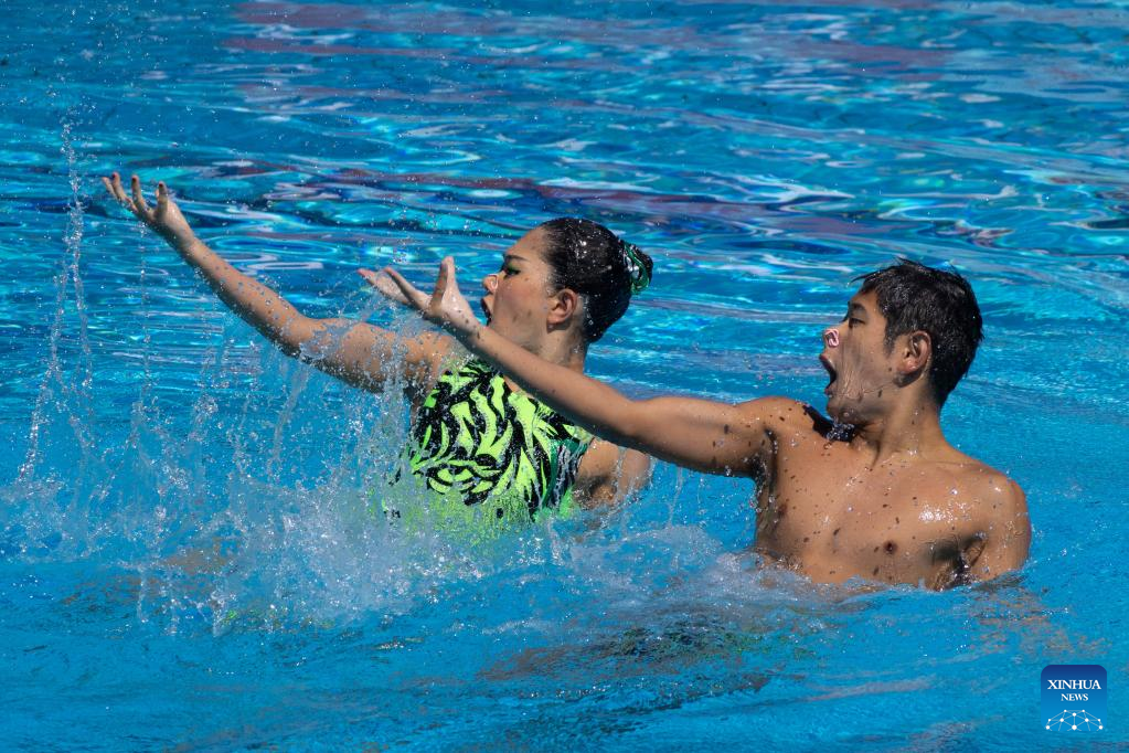 Italy's Giorgio Minisini(L)/Lucrezia Ruggiero compete during the Artistic Swimming Mixed Duet Technical Final at the 19th FINA World Championships in Budapest, Hungary, June 20, 2022. (Photo by Attila Volgyi/Xinhua)