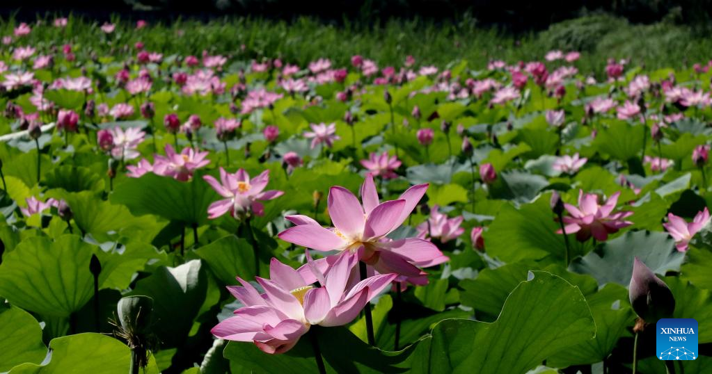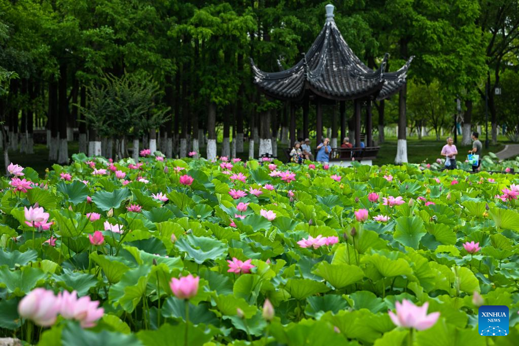Photo taken on June 22, 2022 shows lotus flowers in Huqiu wetland park in Suzhou, east China's Jiangsu Province. (Photo by Hang Xingwei/Xinhua)
