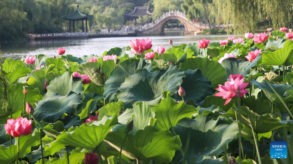 Photo taken on June 21, 2022 shows lotus flowers in the Slender West Lake scenic spot in Yangzhou, east China's Jiangsu Province. (Photo by Qi Liguang/Xinhua)