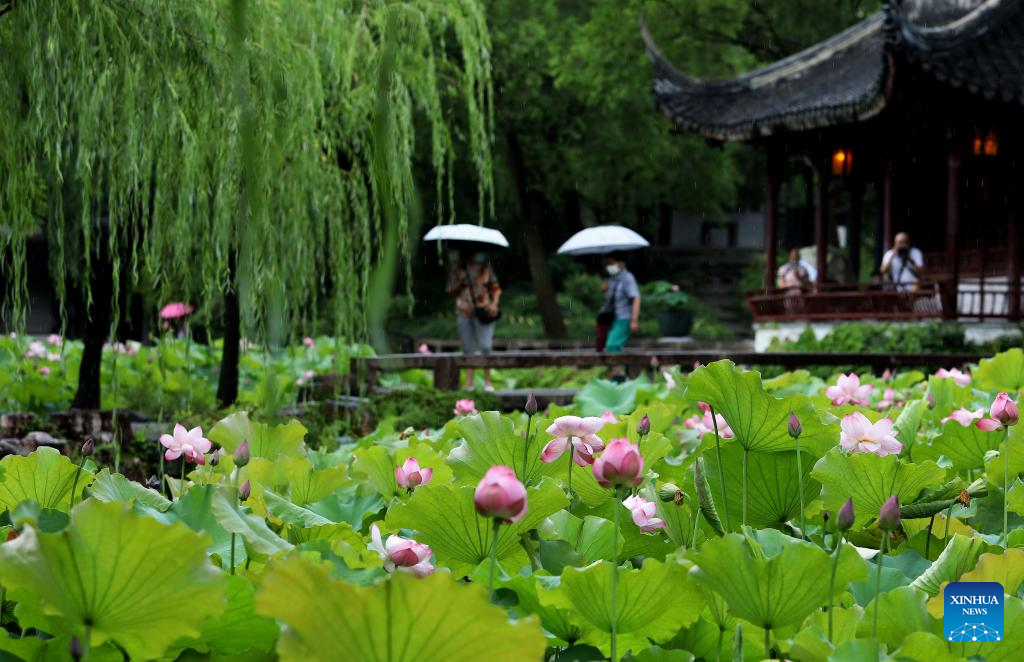 Tourists view lotus flowers amid rain in Humble Administrator's Garden of Suzhou City, east China's Jiangsu Province, June 24, 2022. (Photo by Hang Xingwei/Xinhua)