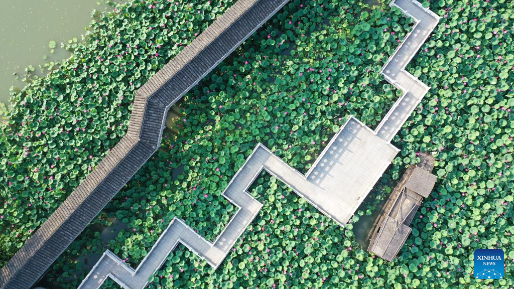 Aerial photo taken on June 21, 2022 shows lotus flowers in the Slender West Lake scenic spot in Yangzhou, east China's Jiangsu Province. (Photo by Qi Liguang/Xinhua)