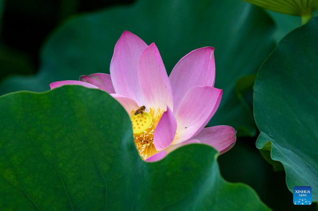 A bee approaches a lotus flower in Chuxiu Park of Huai'an, east China's Jiangsu Province, June 20, 2022. (Photo by He Jinghua/Xinhua)
