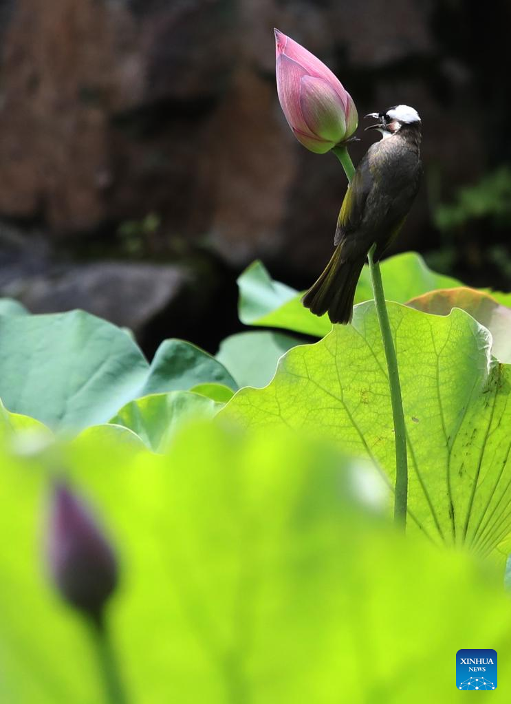 A bird stops on a lotus bud in the Zhuozheng Garden of Suzhou City, east China's Jiangsu Province, June 21, 2022. (Photo by Hang Xingwei/Xinhua)