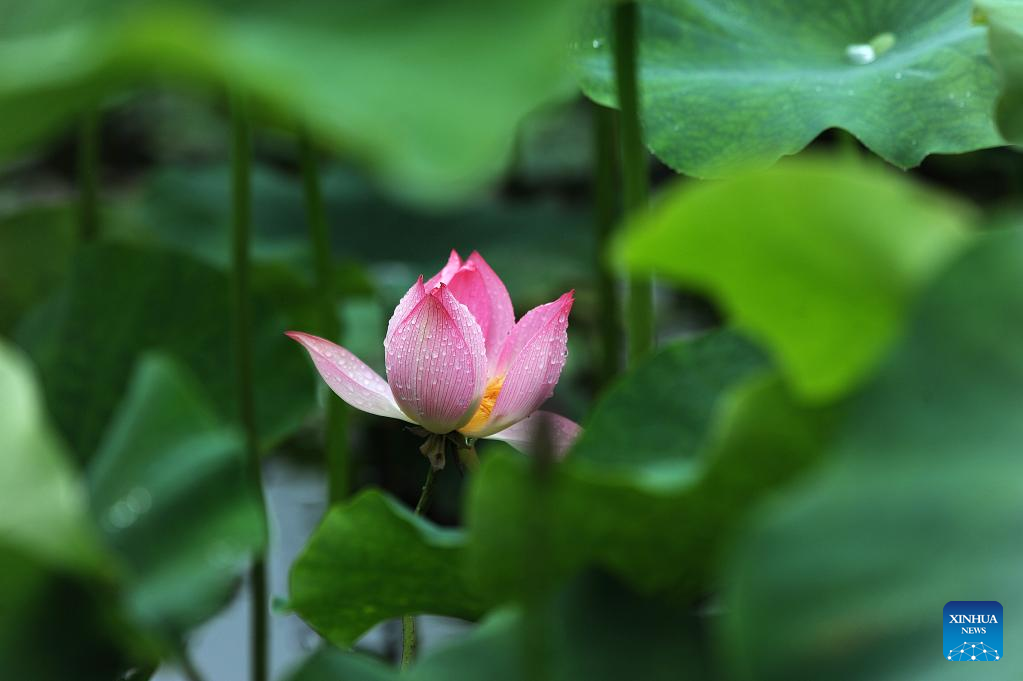 Photo taken on June 21, 2022 shows a lotus flower in the Renmin Park of Bo'ai County in Jiaozuo, central China's Henan Province. (Photo by Cheng Quan/Xinhua)