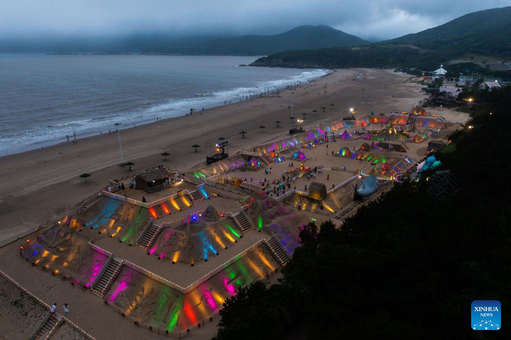 Aerial photo taken on June 28, 2022 shows the sand sculpture display zone decorated by lights at night in Zhoushan, east China's Zhejiang Province. The 23rd Zhoushan International Sand Sculpture Festival opened here recently, with over 60 sand sculptures greeting the public. (Xinhua/Xu Yu)