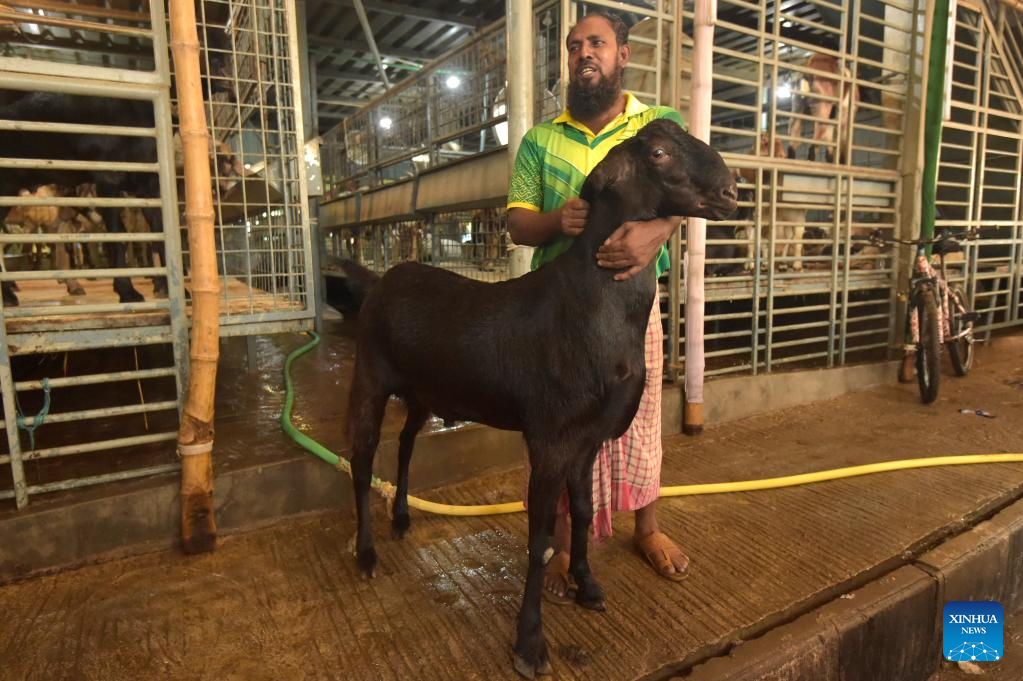 A man shows a goat at a cattle farm house ahead of the Eid al-Adha festival in Dhaka, Bangladesh, on July 3, 2022. (Xinhua)