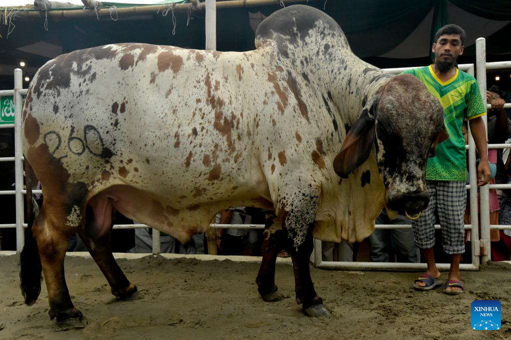 A man shows a sacrificial animal at a cattle farm house ahead of the Eid al-Adha festival in Dhaka, Bangladesh, on July 3, 2022. (Xinhua)