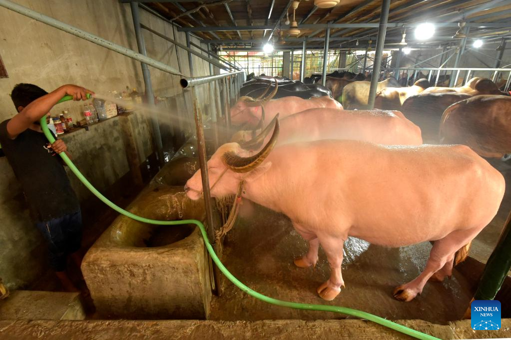 A man baths sacrificial animals at a cattle farm house ahead of the Eid al-Adha festival in Dhaka, Bangladesh, on July 3, 2022. (Xinhua)