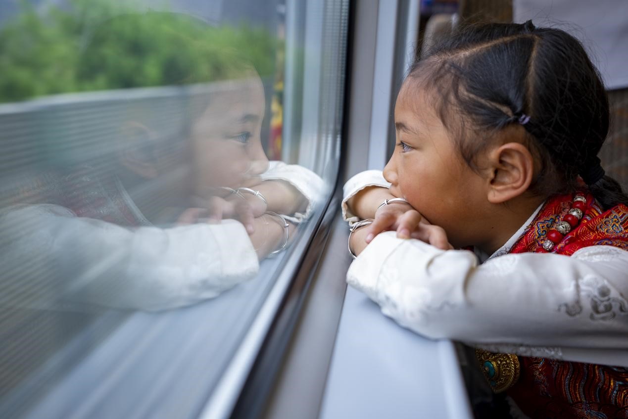 A Tibetan girl looks out a window of a bullet train. (People's Daily/Xu Yuyao)