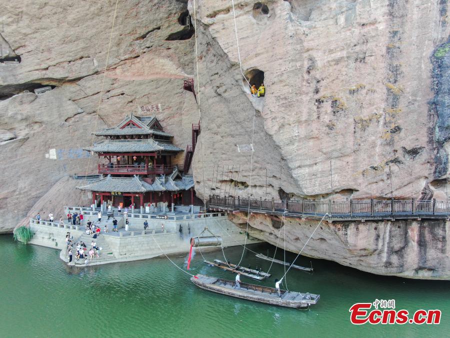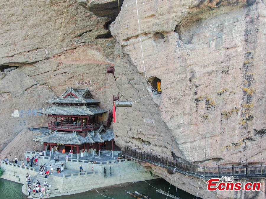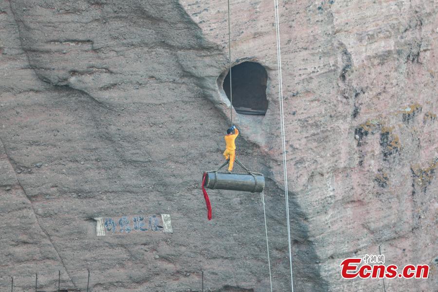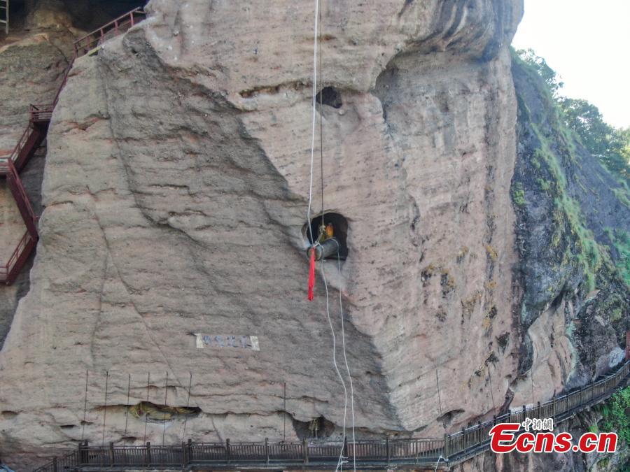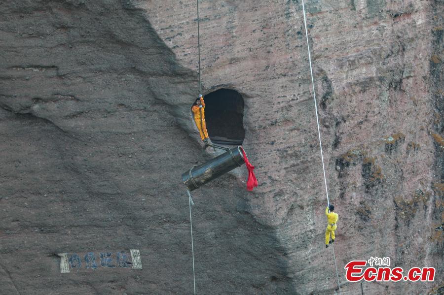 Performers simulate the installation of hanging coffins up onto grottos at the Longhu (Dragon and Tiger) Mountain, east China's Jiangxi province, July 21, 2022. Performers lifted coffins from the surface of Luxi river with pulley and ropes and successfully sent coffins into caves. (Photo: China News Service/Liu Lixin)