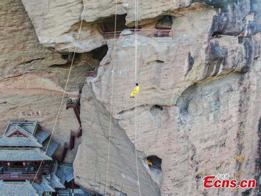 Performers simulate the installation of hanging coffins up onto grottos at the Longhu (Dragon and Tiger) Mountain, east China's Jiangxi province, July 21, 2022. (Photo: China News Service/Liu Lixin)