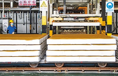 A worker produces a new type of eco-friendly building materials at a company in Xinyu city, east China’s Jiangxi Province, June 22. (Photo/Zhao Chunliang)