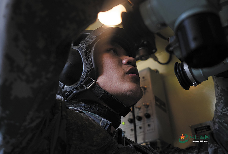 An artilleryman assigned to an artillery detachment with a brigade under the PLA 81st Group Army uses the gun sight to lock the target from the cockpit of a self-propelled howitzer during a day-and-night live-fire training exercise on July 11, 2022. (eng.chinamil.com.cn/Photo by Wu Chao, Liu Qiang and Liang Tianchi)