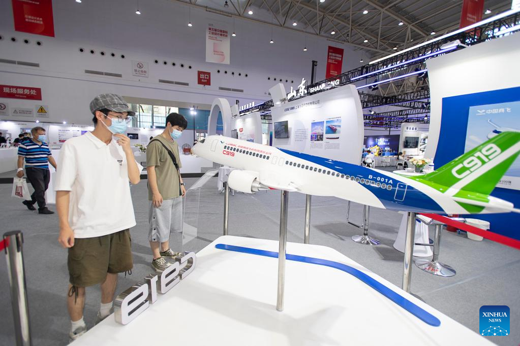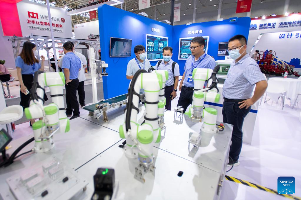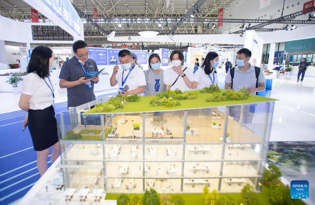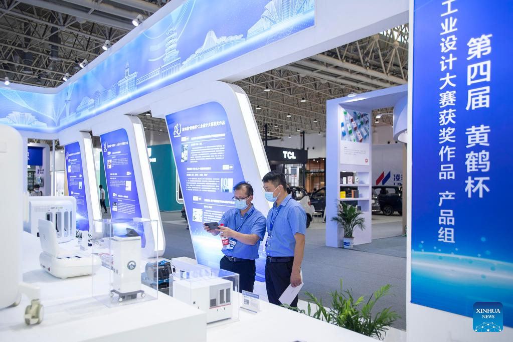 Visitors watch exhibits during the fifth China International Industrial Design Exhibition in Wuhan, central China's Hubei Province, Aug. 5, 2022. With an exhibition area of nearly 30,000 square meters, the fifth China International Industrial Design Exhibition kicked off at the Wuhan International Expo Center on Friday, attracting the participation of approximately 330 enterprises from around the world. (Xinhua/Xiong Qi)