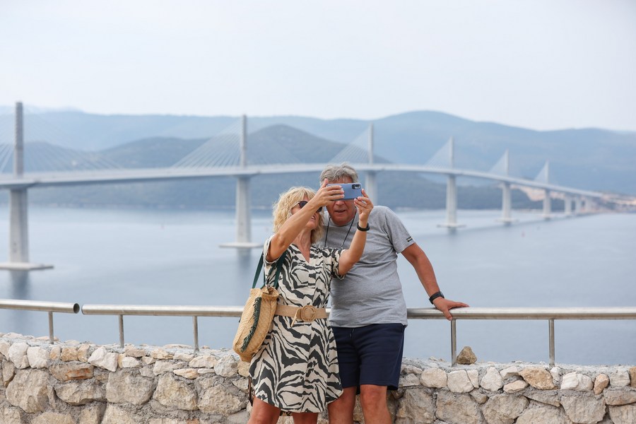 People take photos near the Peljesac Bridge in Komarna, Croatia, July 27, 2022. (Igor Kralj/PIXSELL via Xinhua)