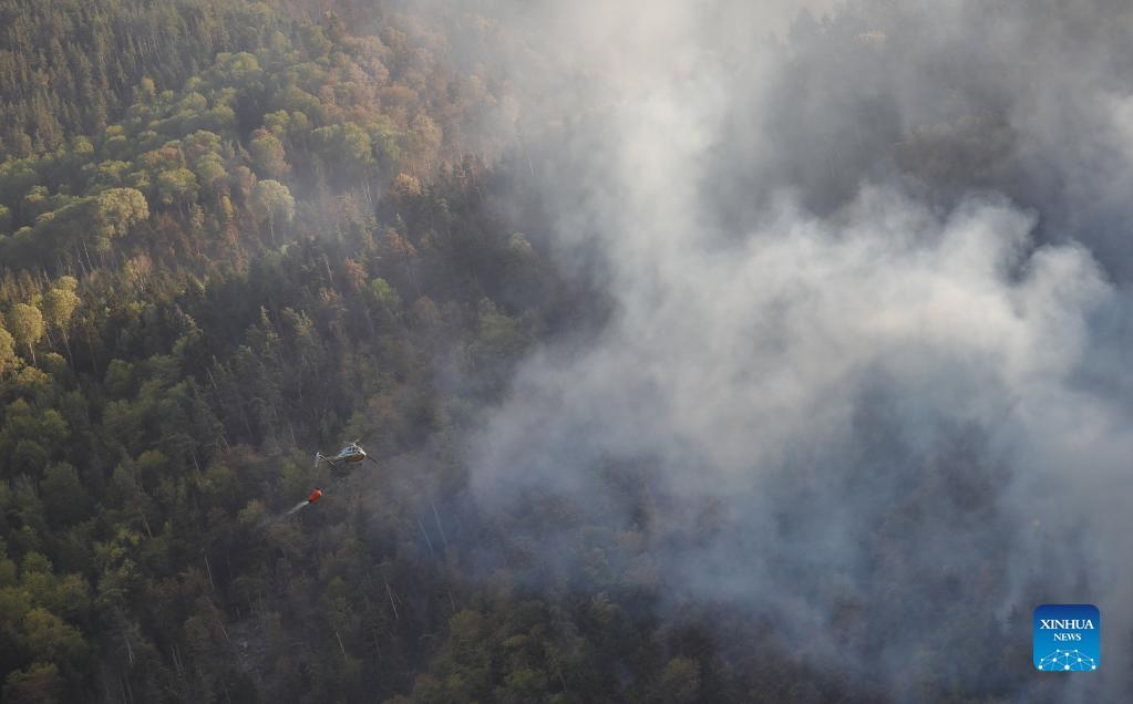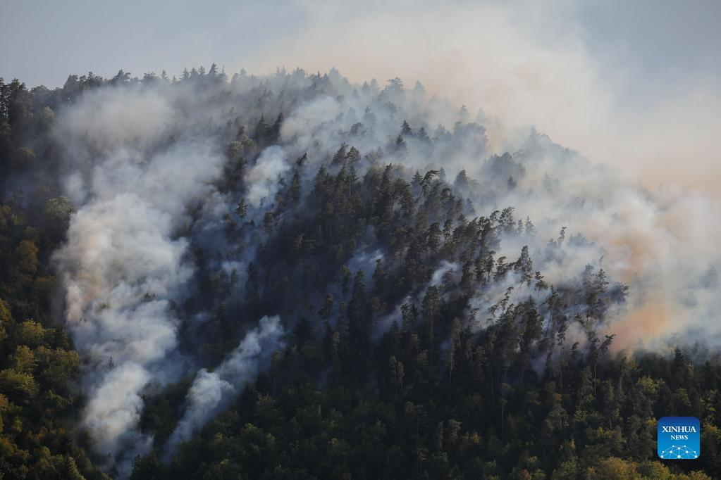 Photo taken on Aug. 24, 2022 shows a fire site in the forest area of the central resort town of Borjomi, Georgia. (Photo by Tamuna Kulumbegashvili/Xinhua)
