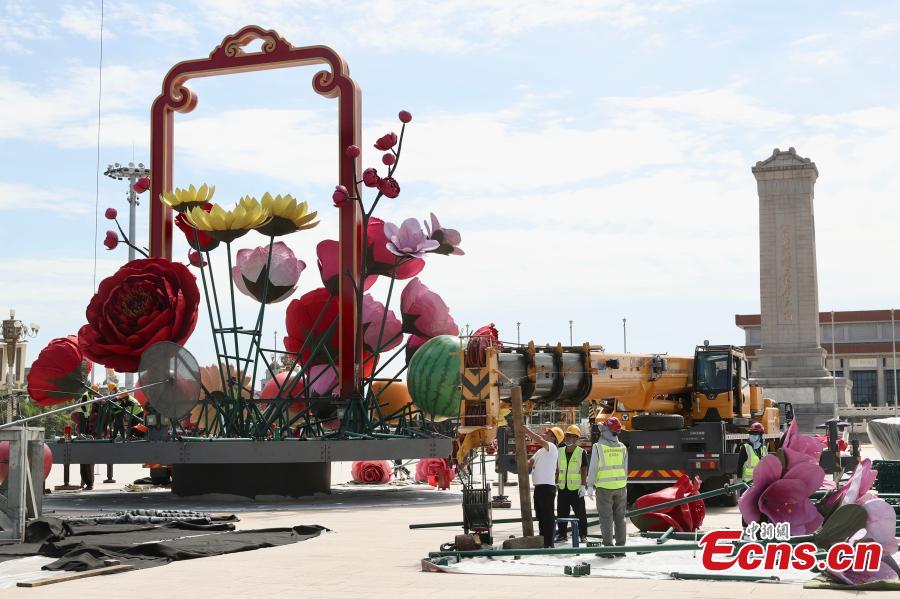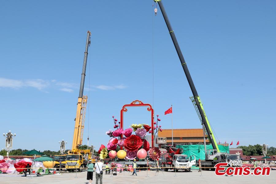 Artificial flowers are being installed at the Tiananmen Square in Beijing, Sept. 19, 2022, to celebrate the upcoming National Day holiday. (Photo: China News Service/Yi Haifei)