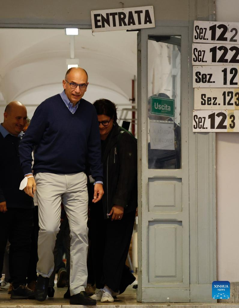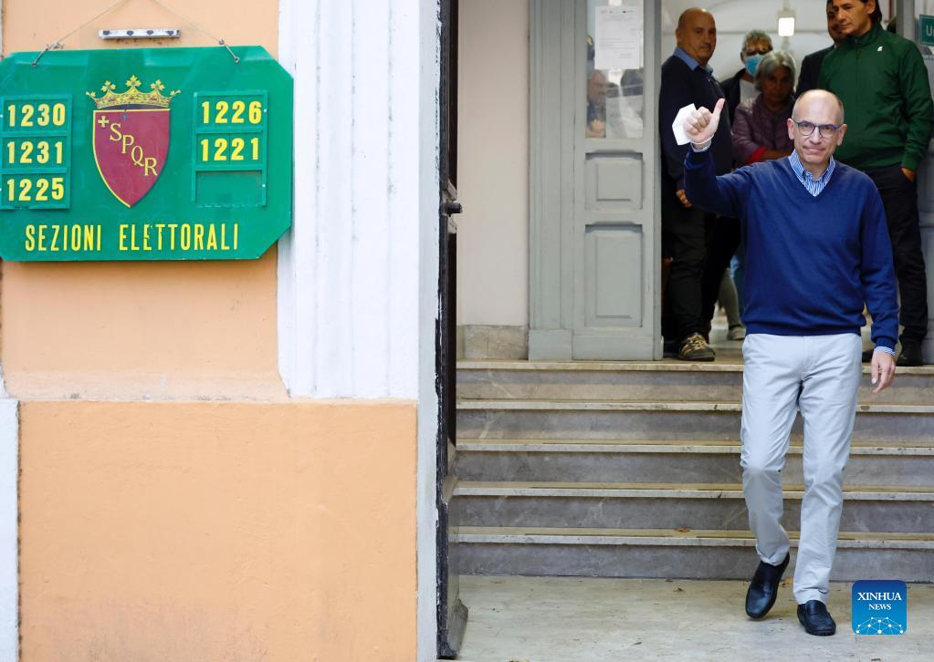 Italy's former Prime Minister and leader of center-left Democratic Party Enrico Letta leaves a polling station after casting his ballot in Rome, Italy, Sept. 25, 2022. Polls opened to renew the parliament in Italy early on Sunday, in a snap election seen as crucial for the country. (Xinhua)
