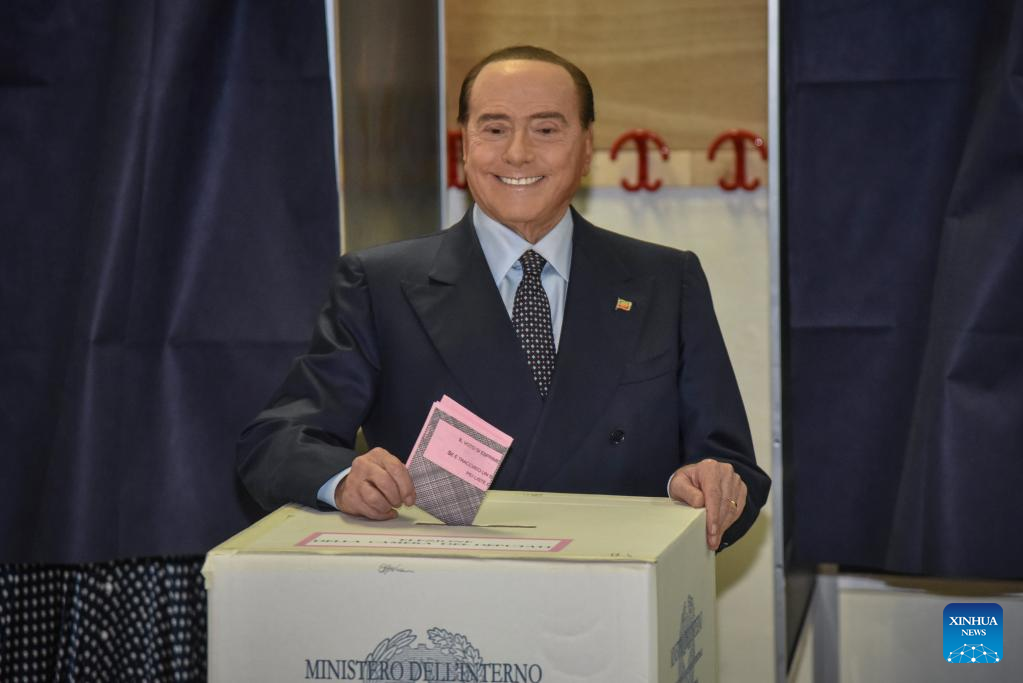 Italy's former Prime Minister and Forza Italia leader Silvio Berlusconi casts his ballot at a polling station in Milan, Italy, Sept. 25, 2022. Polls opened to renew the parliament in Italy early on Sunday, in a snap election seen as crucial for the country. (Xinhua)