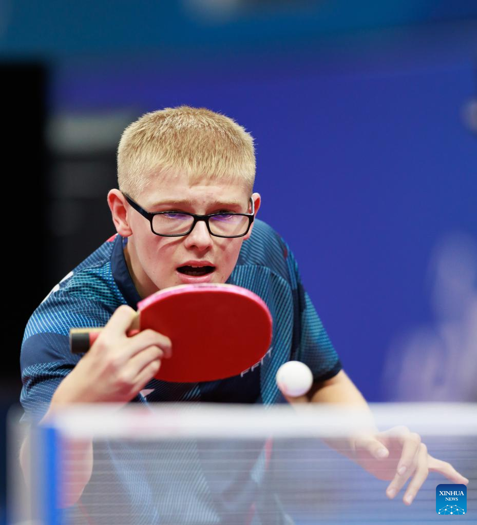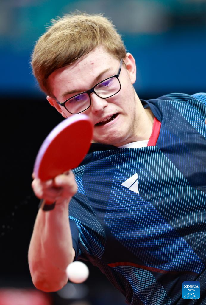 Felix Lebrun of France attends a training session ahead of the 2022 ITTF World Team Table Tennis Championships Finals in Chengdu, southwest China's Sichuan Province, Sept. 27, 2022. (Xinhua/Liu Xu)