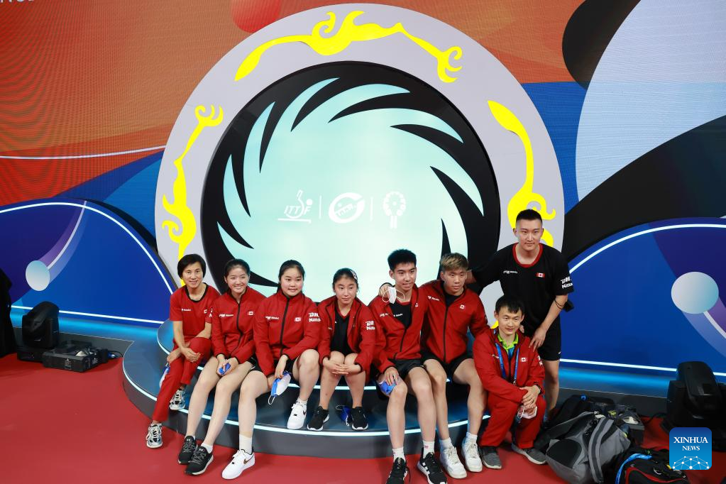 Players of Canada pose for photos during a training session ahead of the 2022 ITTF World Team Table Tennis Championships Finals in Chengdu, southwest China's Sichuan Province, Sept. 27, 2022. (Xinhua/Liu Xu)