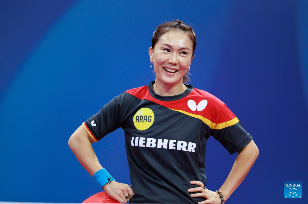 Shan Xiaona of Germany reacts during a training session ahead of the 2022 ITTF World Team Table Tennis Championships Finals in Chengdu, southwest China's Sichuan Province, Sept. 27, 2022. (Xinhua/Liu Xu)
