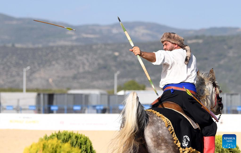 A contestant shows his horseback archery skills during the 4th World Nomad Games in Iznik, Trkiye, Sept. 30, 2022. (Xinhua/Shadati)