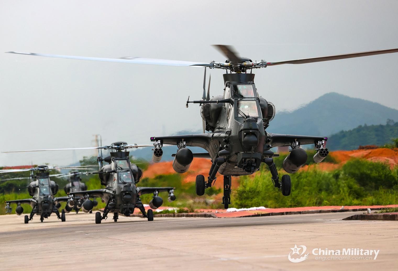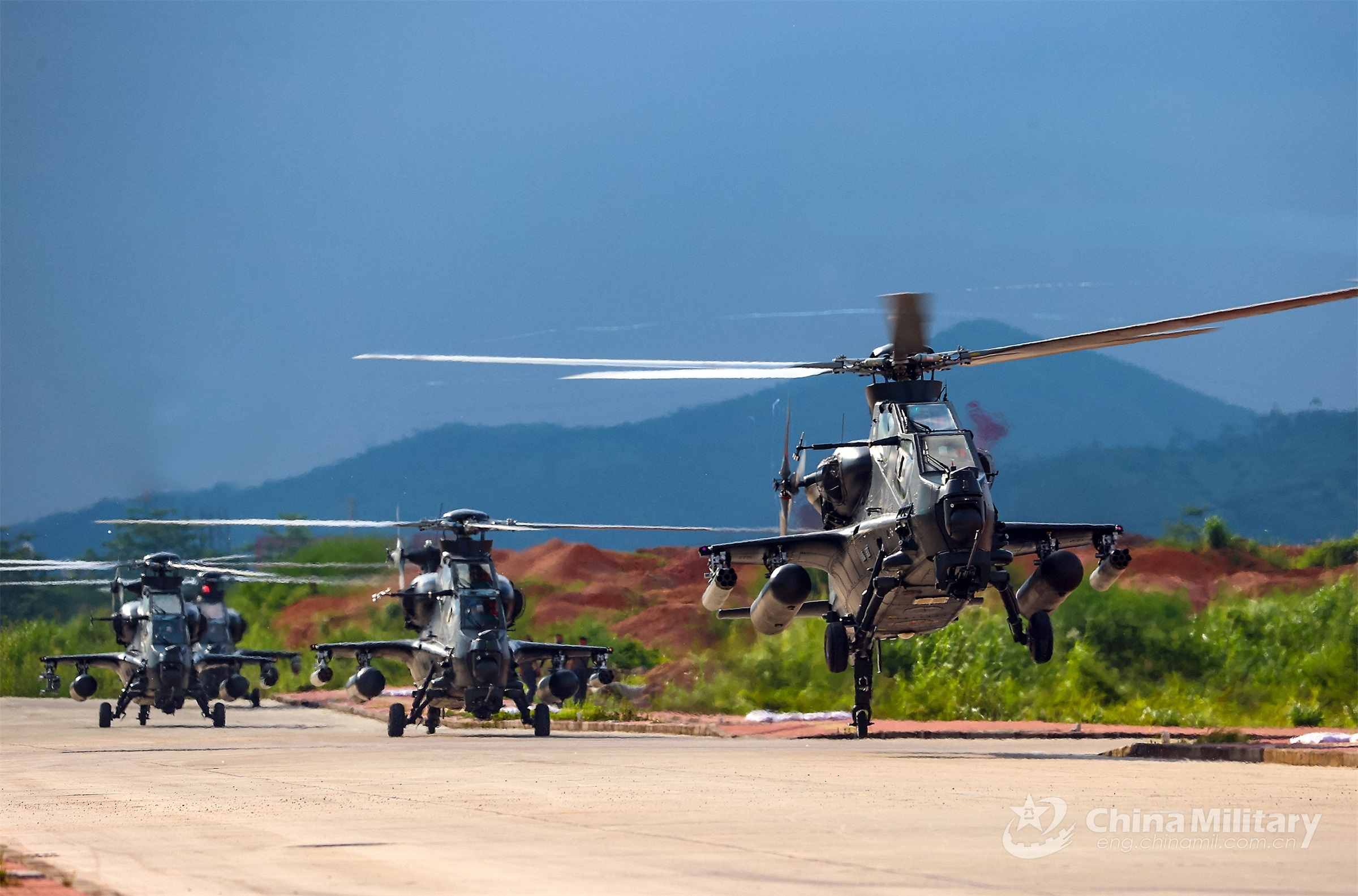 Attack helicopters attached to an army aviation brigade under the PLA Eastern Theater Command lift off in turn for a flight training exercise on September 14, 2022. (eng.chinamil.com.cn/Photo by Zhang Huanpeng)