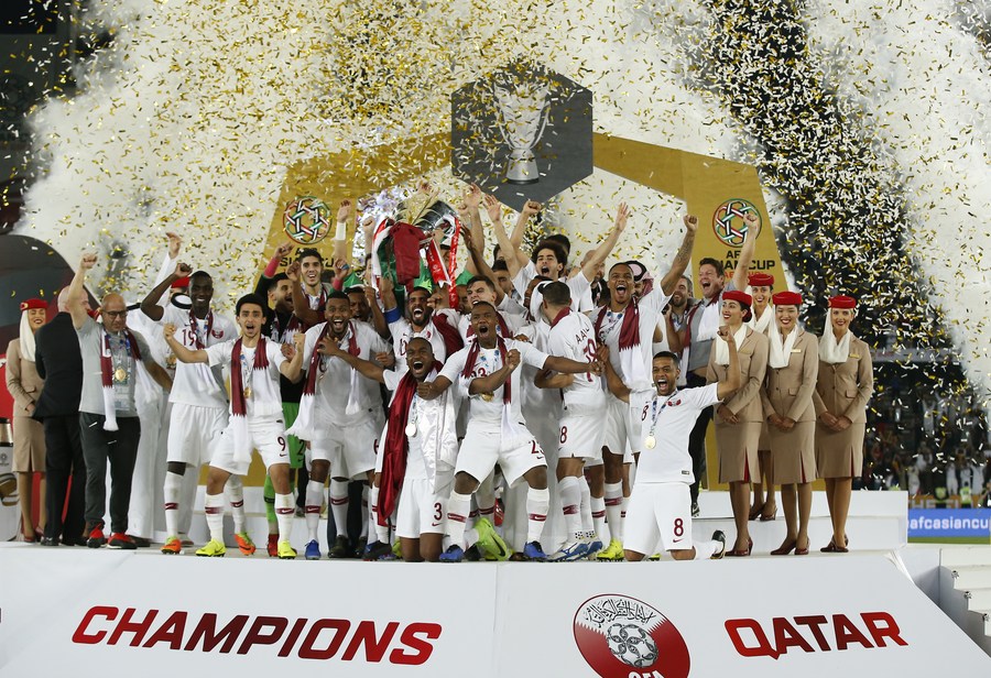 Players of Qatar celebrate on the awarding ceremony after the final match against Japan at the 2019 AFC Asian Cup in Abu Dhabi, the United Arab Emirates (UAE), Feb. 1, 2019. (Xinhua/Ding Xu)