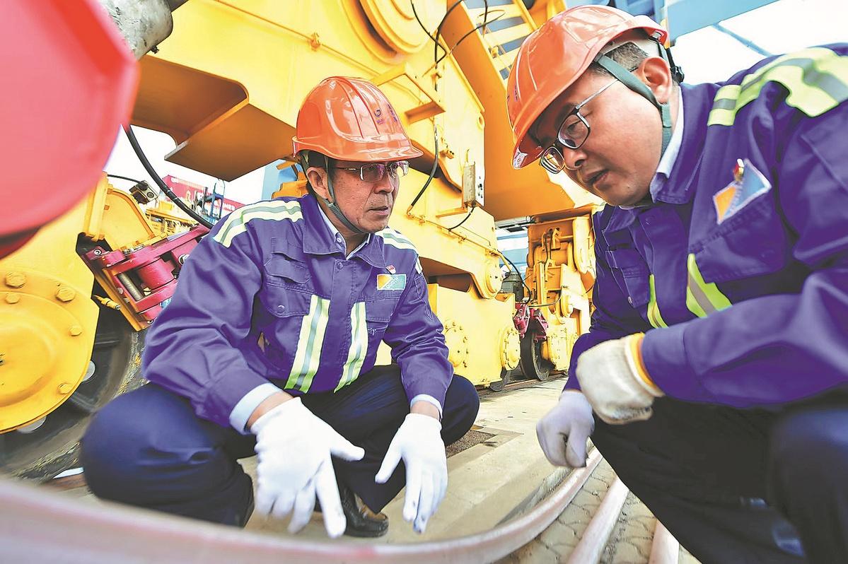 Zhang Liangang (left) talks with a colleague on the automated bridge crane at the Qingdao Port in Shandong province. CHINA DAILY